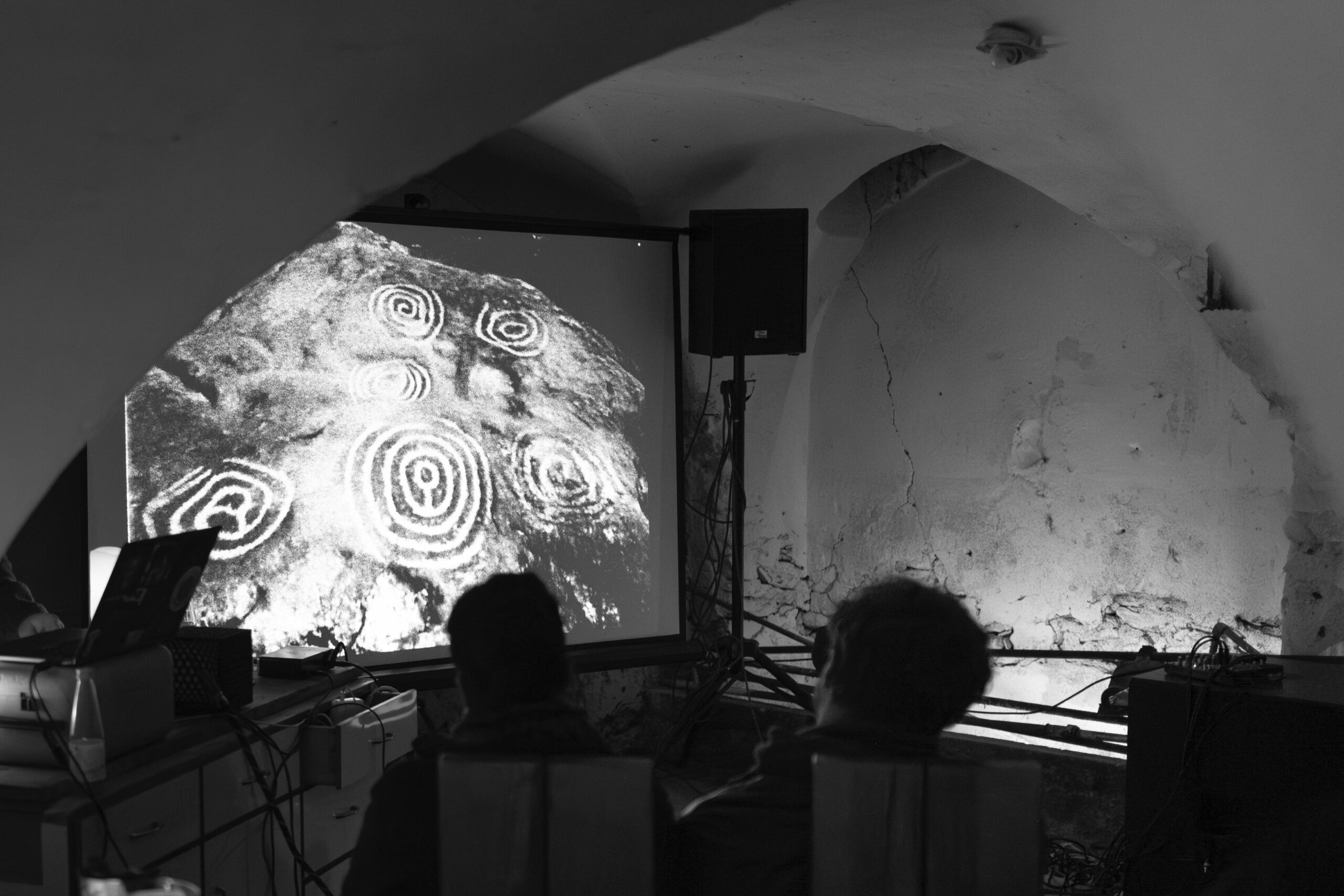Dieser Aspekt der Anverwandlung von Tradition gibt auch in der abschließenden audio-visuellen Performance den Ton an. Das Musikprojekt Staad von Lucas Passenberger lässt uns in die raue und doch so schöne Natur des Alpenraumes eintauchen. Monochrome Visuals werden von einem Zusammenspiel traditioneller, historischer Field-Recordings untermalen. Eben wiegen sich noch Sonnenblumen im Wind, die Schafe reihen sich entlang Serpentinen Richtung Tal, das letzte Heu wird eingefahren. Dann fällt der erste Schnee, unheilvolle Laute werden gespielt. Mit dem Anschwellen einer Lawine ertönt ein altes Krippenlied.