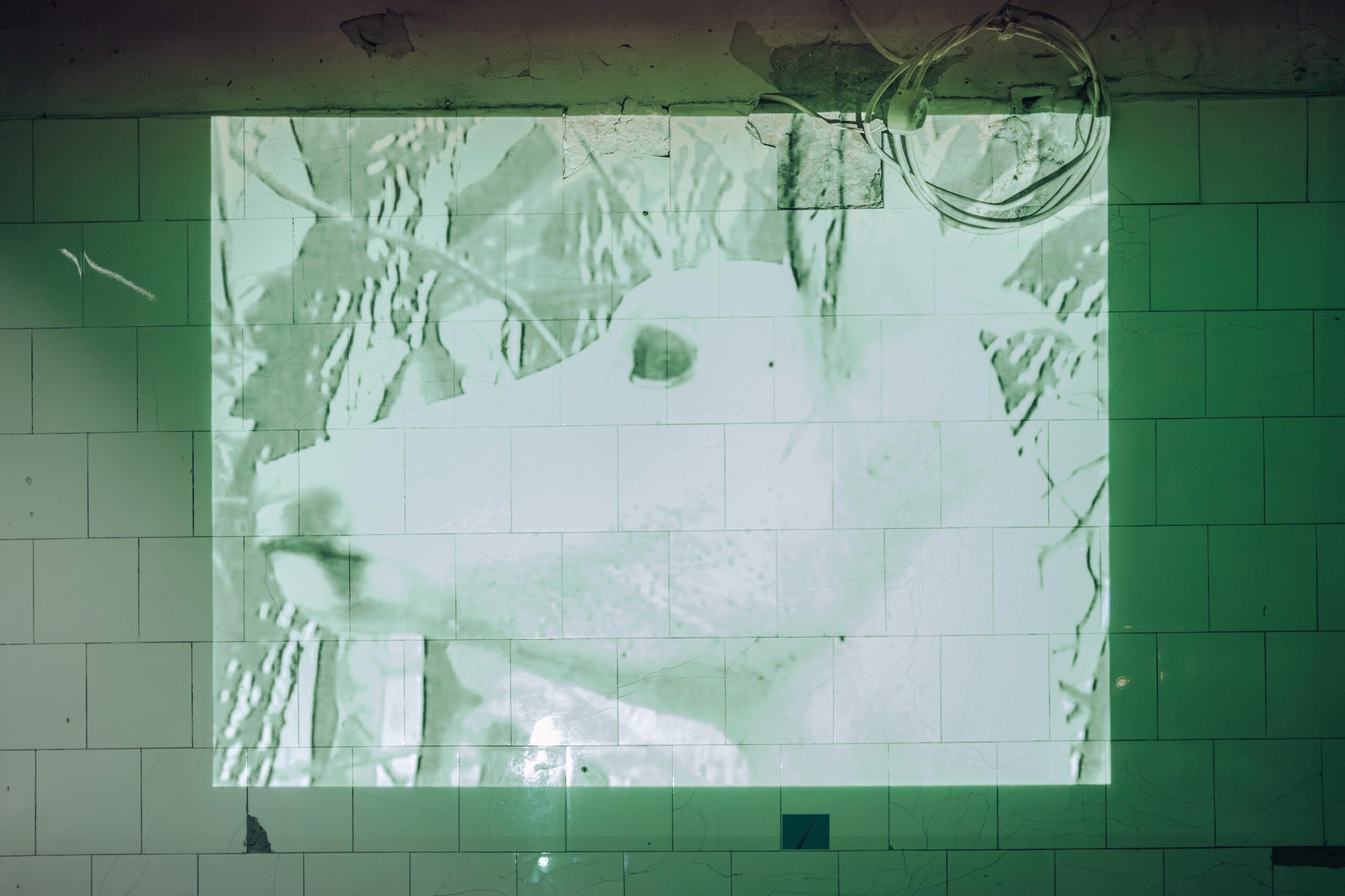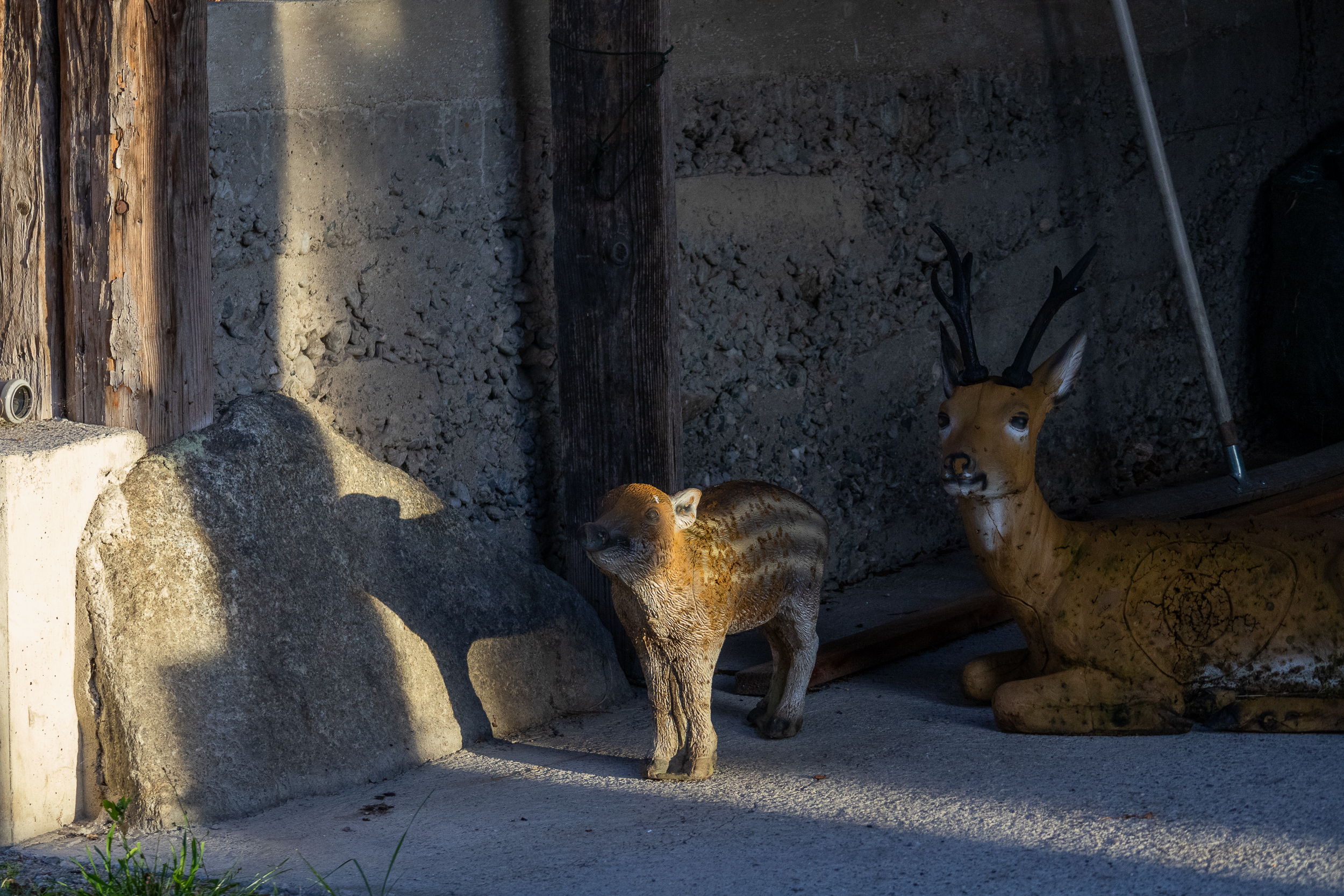 Inspiriert von der Energie des Ortes und der Umgebung schuf die Künstlerin während ihres Aufenthalts eine multimediale Installation, die durch den Abend führt und von Brigitte Egger und Anastasiia Diachenko kuratiert wurde. Beim Betreten des Grundstücks begrüßt uns schon eine Gruppe ungewohnter Besucher*innen: Murmeltier und Frischling, Fuchs und Reh liegen friedlich und reglos nebeneinander. Schaumstofffiguren, deren durchlöchertes Fell Kreise zieren. Oksana Pohrebennyk waren diese Nicht-Tiere bei ihrem ersten Besuch im Rietzer Wald aufgefallen, im Bogenparcour. Ihr Mitgefühl für die Weggenossen*innen bewegte die Künstlerin dazu, den Tieren eine Geschichte vorzulesen: Ein Kapitel aus dem Kurzroman Schattenfuchs des isländischen Autors Sjón, das von einem Jäger und einem Fuchs erzählt. Auf die geflieste Wand des ehemaligen Metzgerei-Ladens projiziert, läuft nun die daraus resultierende Videoarbeit Playground.